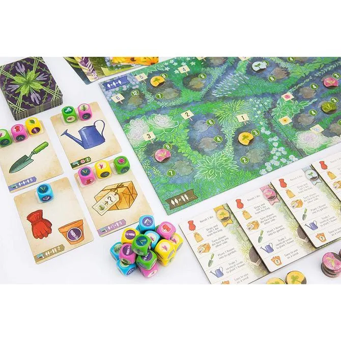 Become the Head Gardener by collecting herb and flower seeds and using your garden tools to plant in the community garden and scoring the most points. Each round, gardeners take turns collecting herb and flower seeds (represented by dice) which they place and save in their wheelbarrow, as well as tools (represented by cards) which they use to plant sprouts. Players can plant quickly for low point spots, or push their luck saving their seeds for premier spots in the garden.