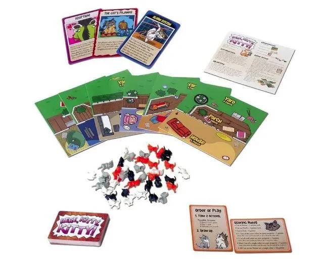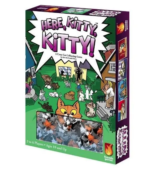 In the crazy cat-collecting game Here, Kitty, Kitty!, your neighborhood has a cat problem. The problem is that the cats don't all belong to YOU! Everyone in the neighborhood wants to claim those adorable kitties for themselves. Outwit your fellow feline fiends as you lure cats onto your property, move cats into your house, and steal cats from your neighbors. All's fair in love and cat-collecting! There are no blenders or explosions in this game, but if you use your "Catlike Reflexes" and avoid "Stray Dogs" and "Hairballs", you might just "Land on Your Feet"!