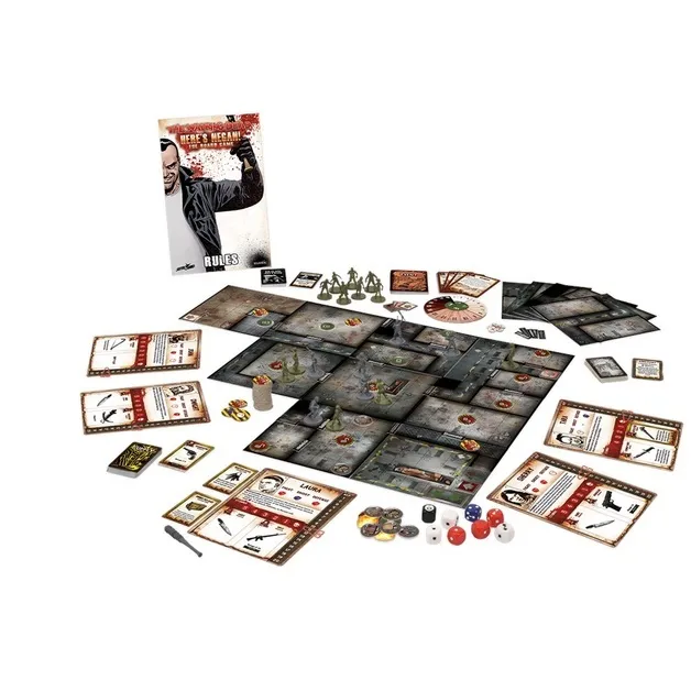 Here’s Negan is a co-operative board game for 1 to 5 players, based on The Walking Dead comic-book series. Each player takes the role of a Survivor, recruited by the ruthless Negan. Under Negan’s instructions, the Survivors must battle to clear out a large factory complex to create a safe haven in the brutal wilderness. By scavenging supplies, securing key objectives and fighting the walking dead, the players hope to win Negan’s favour and ultimately become his top lieutenants.