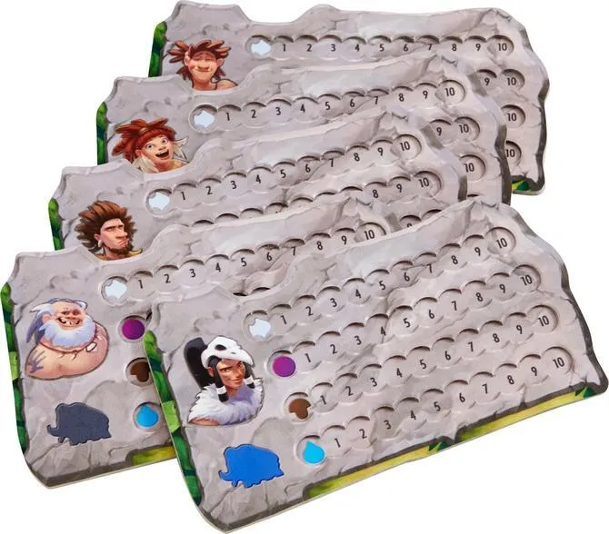 1 game board, 1 depot board, 5 player trays, 46 action disks (28x gray, 18x red), 25 bonus cards, 32 barter cards,1 starting player fire marker, 1 mammoth tooth, 1 Honga play figure, 30 mammoths, 5 prehistoric humanscavemen, 5 scoring markers, 20 raw food material markers (5x fish, 5x berry, 5x mushroom, 5x drop of water), 1 set of instructions.