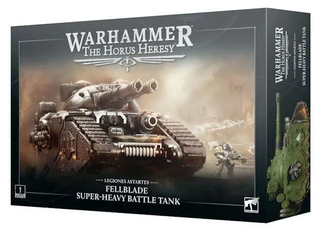 This multipart plastic kit builds a Fellblade Super-Heavy Battle Tank, a behemoth of destruction for your Legiones Astartes armies in games of Warhammer: The Horus Heresy. Protected by thick armour plating, it can withstand incredible amounts of damage, soaking up firepower that would tear through lesser tanks. In reply, the turret-mounted Fellblade accelerator cannon can eradicate enemy vehicles and troops with ease. Its secondary armament is a hull-mounted demolisher cannon – a fearful weapon in its own right. The Fellblade is ideal for dominating the battlefield and providing support to your infantry advance. This model measures an imposing 131mm by 252.5mm, making an impressive centrepiece for your collection.