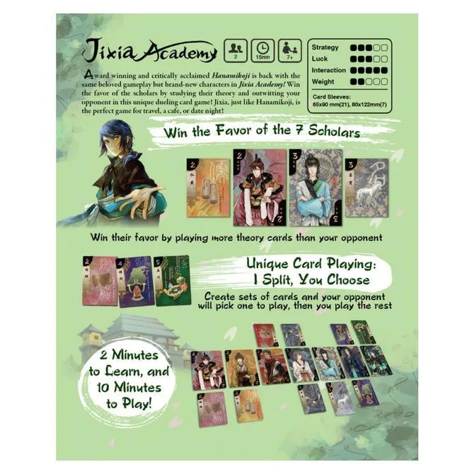 Experience Hanamikoji with a brand new cast of characters! Jixia Academy takes two minutes to learn and ten minutes to play, and its unique card play makes every game a thrilling battle of wits.