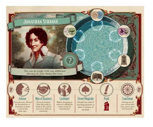 After centuries of absence, magic has returned to England, but not all are using it for good... Take on the role of an aspiring magician and start your journey down the path to greatness. Collect rare books, flit between social engagements, and impress your peers with feats of magic. Be careful to strike a balance between your studies and your status, for the gentleman with the thistle-down hair has plans of his own, and it will take all of your strength to stop him. In Jonathan Strange & Mr Norrell: A Board Game of English Magic, players take on the role of four principle characters from the novel — Jonathan Strange, Mr. Norrell, Miss Redruth, or John Segundus — and travel around England and Europe, attending social engagements and performing feats of magic in the hope of becoming the most celebrated magician of the age. On their travels they encounter a host of familiar characters, from the jovial Mr. Honeyfoot and beautiful Lady Pole to the extraordinary Stephan Black and the enthusiastic Lord Portishead. All the while, they must build up their magical abilities as the gentleman with the thistle-down hair is weaving his magic in the background and must be stopped for any player to have a chance of claiming victory.