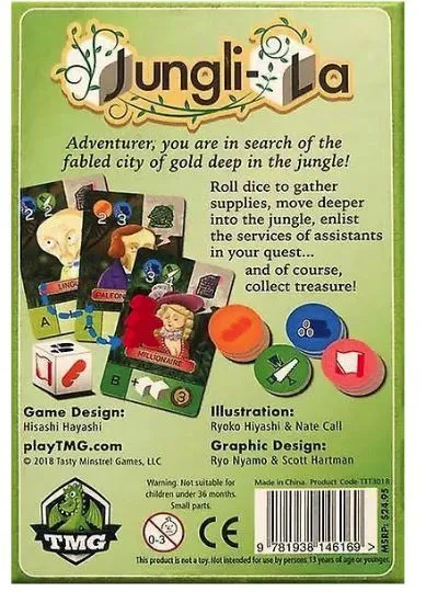 Each player in Jungli-La is a daring explorer, progressing through the secret lands of the jungle in search of the fabled lands of the village of gold. However, the jungle is full of obstacles to overcome, and moving forward blindly will be a fatal endeavor. With your trusty dice, you need to acquire food, wood, and a variety of tools and resources to use in your journey. You also need letters to grant you abilities along the way that allow you to change your dice, exchange artifacts, and gain various benefi ts. Who will be able to reach the storied village of gold and earn the most fame to become the explorer of legend?
