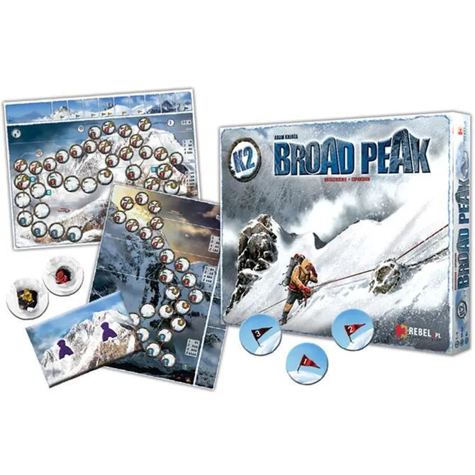 K2: Broad Peak is an expansion for the mountain-climbing game K2 that includes a double-sided game board, tokens and new rules. The game board features the twelfth-highest mountain in the world, formerly known as "K3" and now typically called "Broad Peak" due to the length of its summit.