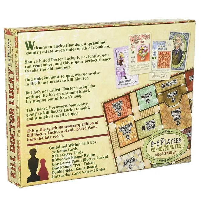 The object? Kill Doctor Lucky. Find a weapon, track the old man down, and do him in. The obstacles? For one thing, all of your friends would rather do it first. For another, Doctor Lucky is aptly named. You would think that after being stabbed, hung, poisoned, and poked in the eye, the Old Doctor would just lie down and accept his fate. But he's got more lives than Rasputin, and an uncanny knack for dodging your best traps.