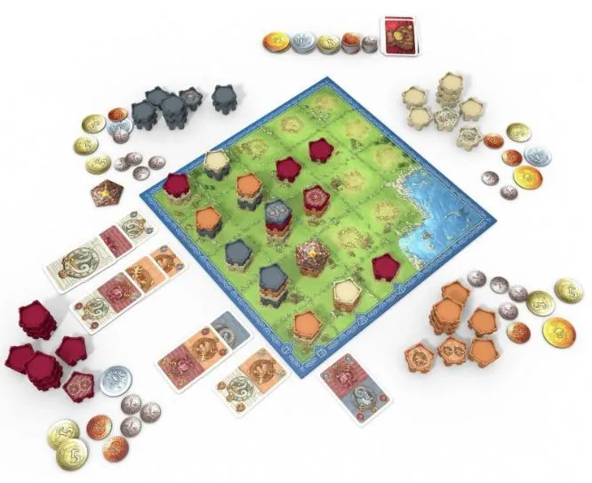 Kilt Castle adds a simple and highly interactive card mechanism to the classic Euro game genre of outbuilding one's opponents in an attempt to control the largest territory. The game board shows a grid of 5x5 squares. Ten cards are placed beside the first four rows in stacks of 4, 3, 2 and 1 card. On their turn, the player picks up an open card from one of the stacks next to the game board and places it in another row — always in a clockwise direction. All players whose colors are on that card (one or two) are then allowed to build a new tower or build on top of an existing tower in this particular row. Building on an open space is free, while building on top of somebody else's tower costs as many ducats as the number of "floors" already built. A player can decide to trigger a general round of scoring simply by moving the last card of any stack. High towers are a good way to claim a large, connected territory and collect a lot of ducats.