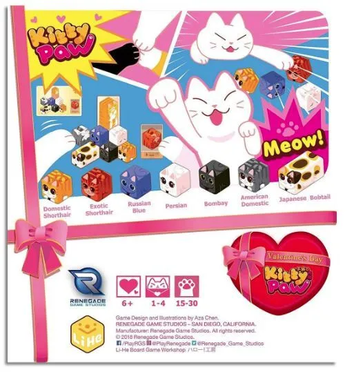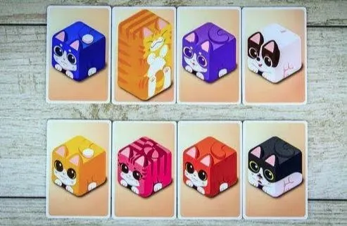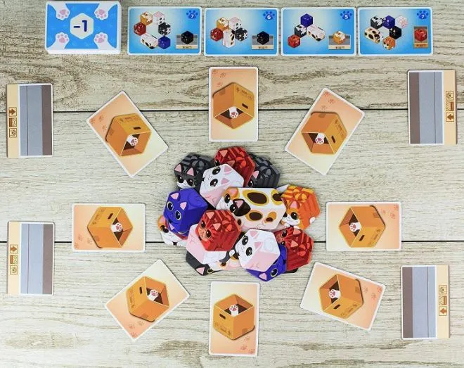 What happens when seven cats run into cardboard boxes? Well, a crazy game of kitty hide-and-seek! Kitty Paw is a dexterity and reaction game. Players try to be the first to complete the kitty combinations shown on the Kitty cards to score victory points (VP). The player with the most VP in the end wins. Each player gets one Kitty card in each round and tries to be the first to create the patterns shown on the cards. Since this is a recognize-and-react game, all players act simultaneously.