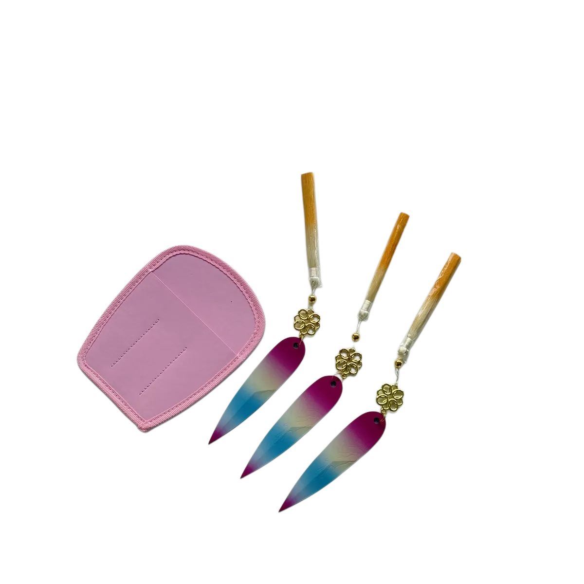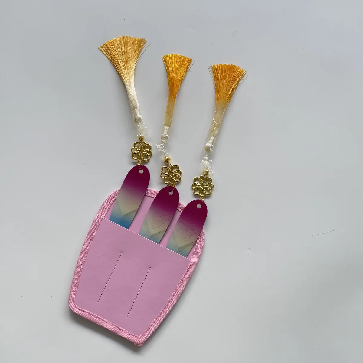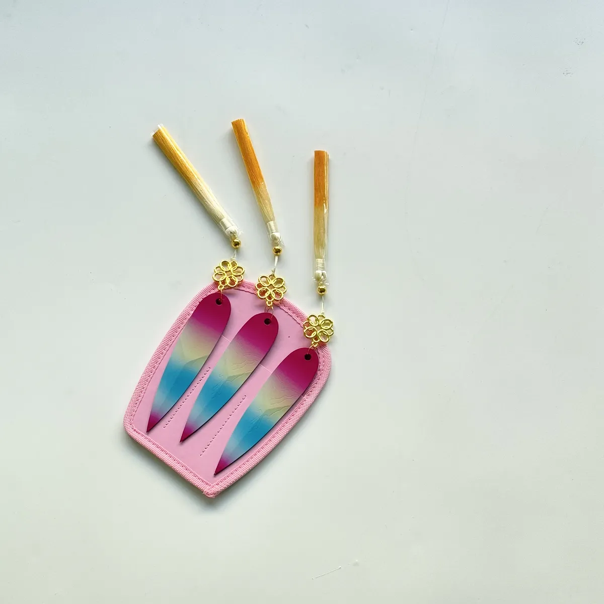 The blade is accented with electroplated gold fittings, a gradient tassel, and comes with a pink sheath, making it a stylish collectible piece despite its small size.