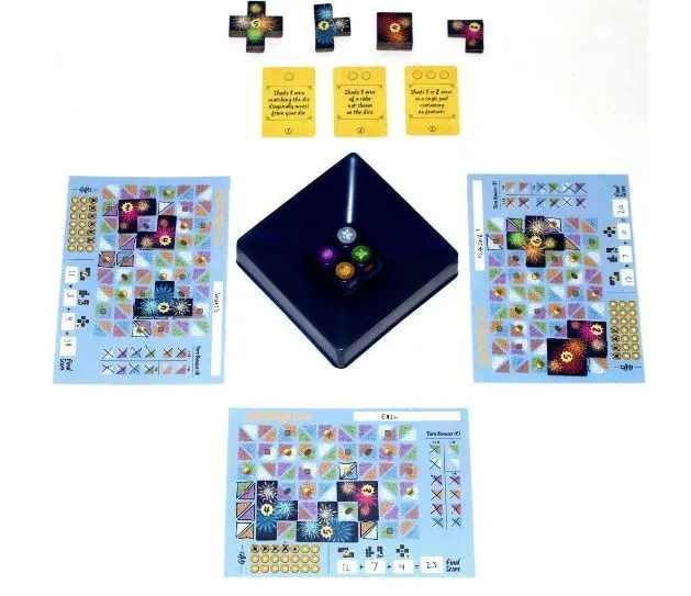 The harvest is in, and now it's time to celebrate! The emperor has declared that this shall be the best harvest festival yet. In Lanterns Dice: Lights in the Sky, players act as artisans, decorating the palace lake with floating lanterns and launching fireworks to light up the sky. The player who earns the most honor has made the best impression on the emperor and wins. In more detail, roll dice and choose which colored lanterns players can fill on their scoresheets. Earn gifts to perform special actions, fill in additional colored lanterns, and create powerful combinations. Cover completed shapes with fireworks tiles to score points and put on a spectacular show