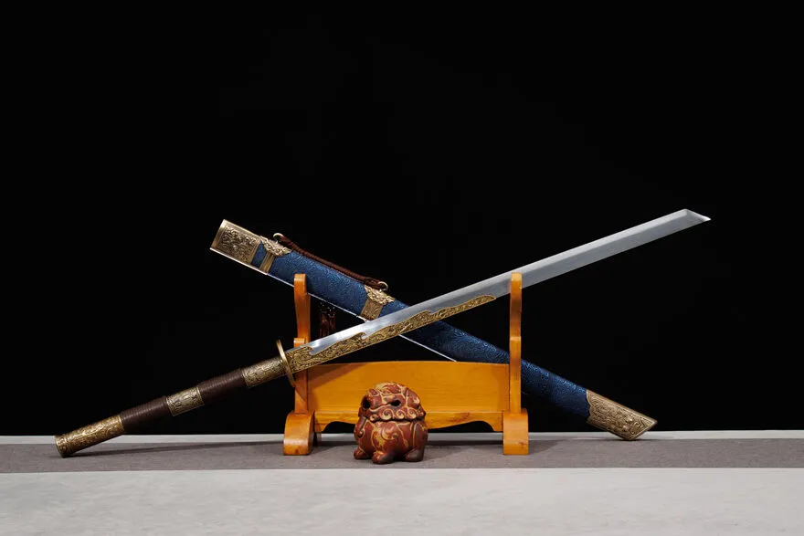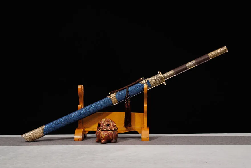 Elegant Tang-style sword with constellation-themed fittings and a deep-blue, leather-wrapped scabbard. Hand-finished in the Longquan tradition for display, cosplay, or non-contact forms. Blade is unsharpened for safe handling.