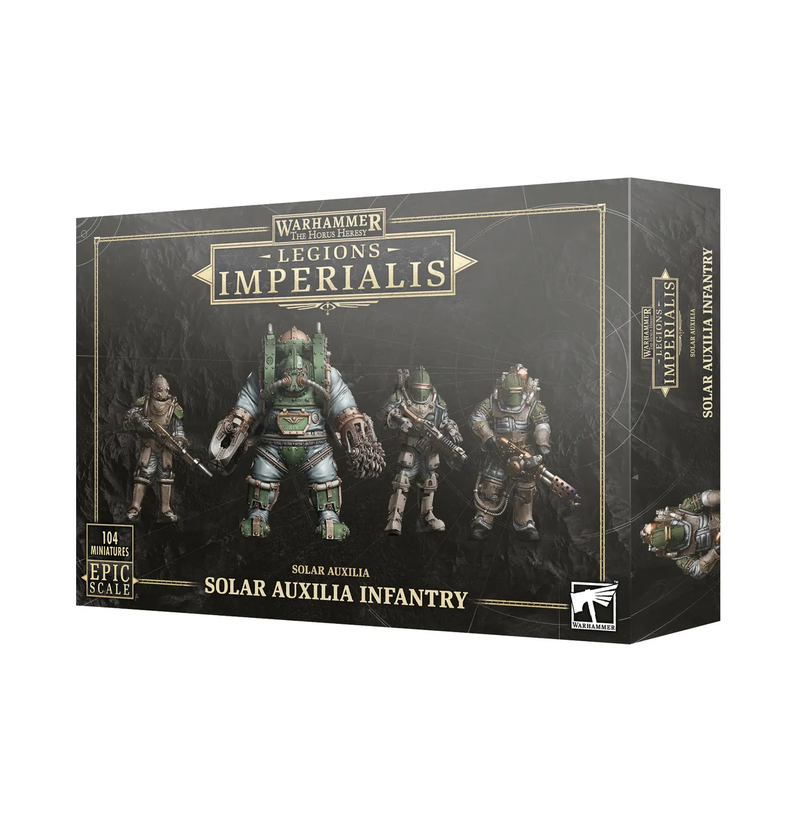 This multipart plastic kit builds 104 epic scale Solar Auxilia miniatures, split over 26 bases. From the lasrifle-toting tercios of Auxilia troopers to the elite axe-wielding Veletarii, the Solar Auxilia stand ready to take and hold objectives through firm discipline and sheer weight of numbers. Supported by the likes of Legate Commanders, flamer squadrons, the massive Charonite Ogryns, and Aethon Heavy Sentinels, they pack a deadly punch for anyone that underestimates the worth of mortal soldiery.