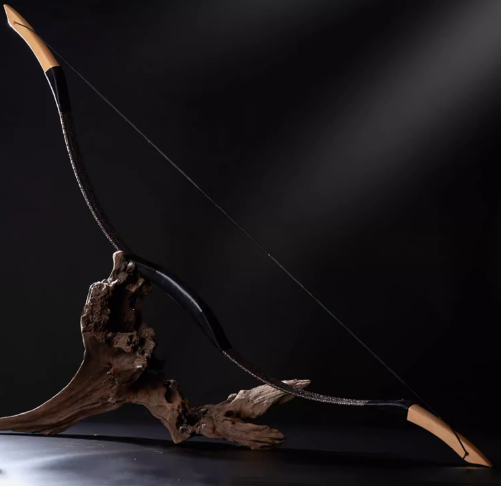 The bow features a brace height of 20 cm and an overall length of 130 cm. The limbs are crafted from epoxy resin and wrapped in leather, ensuring stable performance and a sophisticated appearance. The riser is made from locust wood, while the leather-wrapped grip is hand-stitched, offering a comfortable and secure hold.