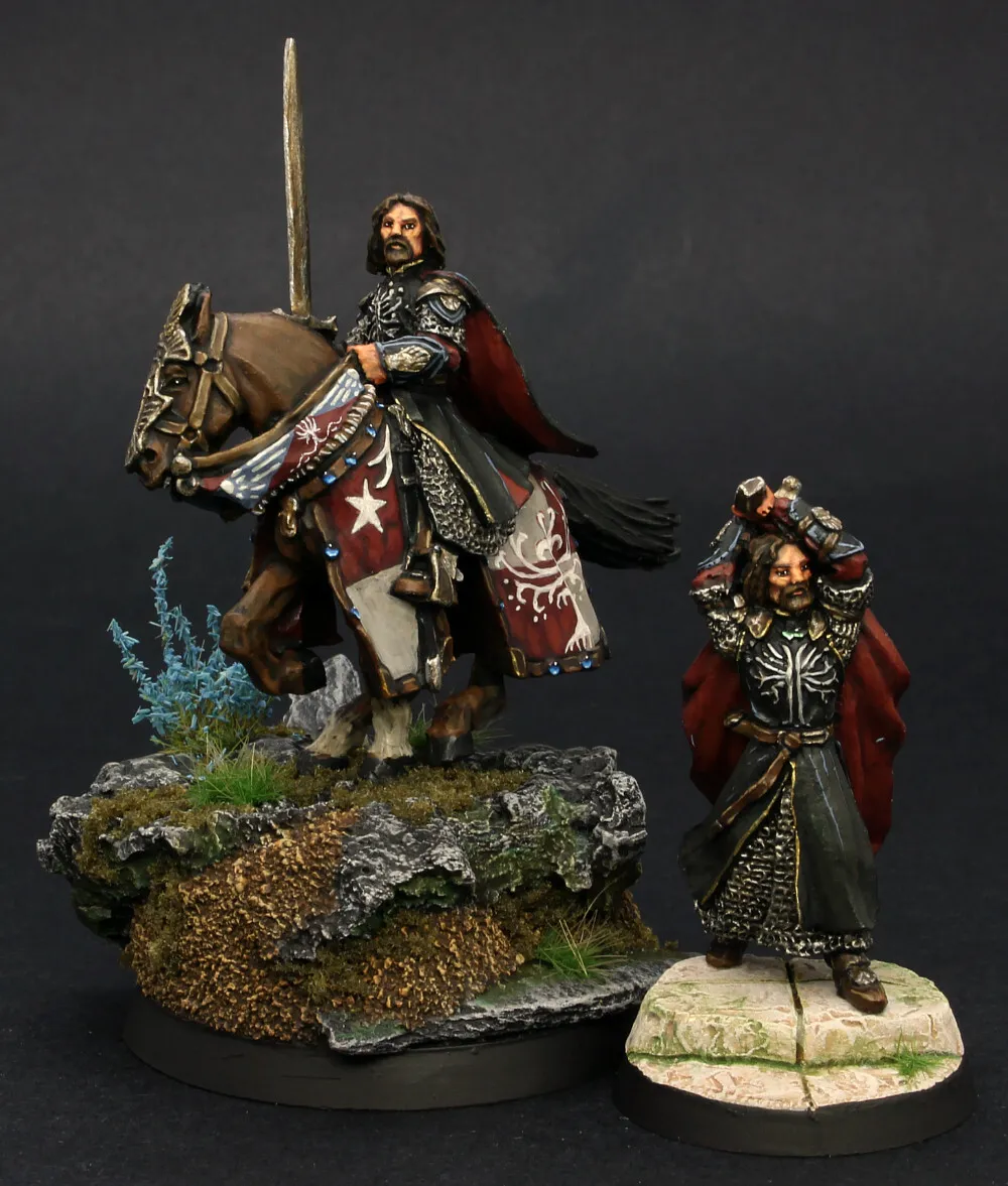 This pack contains 2 miniatures - Aragorn on foot, and riding a horse. These models are resin cast miniatures. They are supplied as 5 separate components, and come with 1 25mm round base and 1 40mm round base.