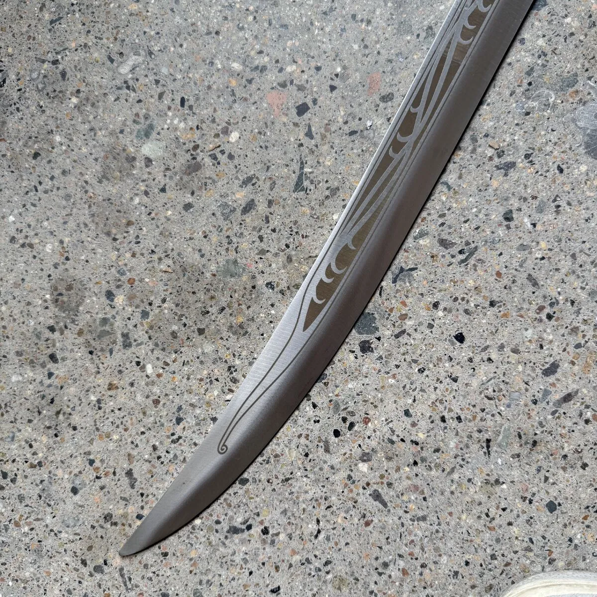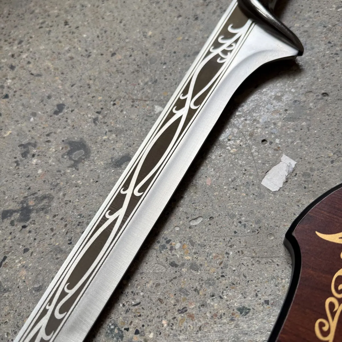 The blade is forged from high-quality stainless steel, showcasing graceful Elven curves and etched detailing inspired by the artistry of Middle-earth’s finest smiths. The elongated hilt features intricate patterns that reflect the timeless craftsmanship of the Elves, making it as much a work of art as a weapon.