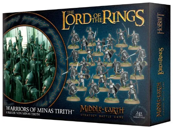 This plastic boxed set contains 32 components, with which to build 24 Warriors of Minas Tirith: 8 with bow, 8 with sword and shield, and 8 with spear and shield. This set comes with 24 25mm round bases. These miniatures are supplied unpainted and require assembly - we recommend using Citadel Plastic Glue and Citadel Paints.