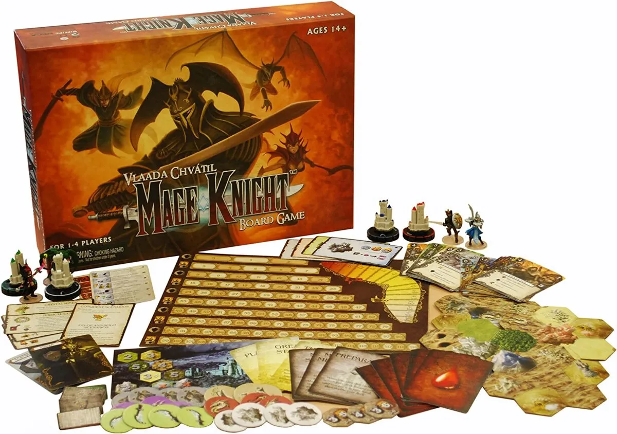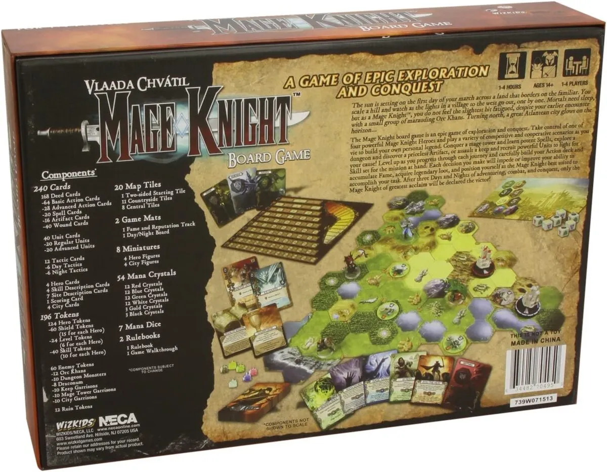 The Mage Knight Board Game throws you and up to three other Mage Knights into the sprawling and ever changing world of the Atlantean Empire, a land that is but a distant memory since your transformation into a mysterious Mage Knight. Build your armies, defeat bands of marauding enemies, and eventually conquer cities in the name of the mysterious Void Council.
