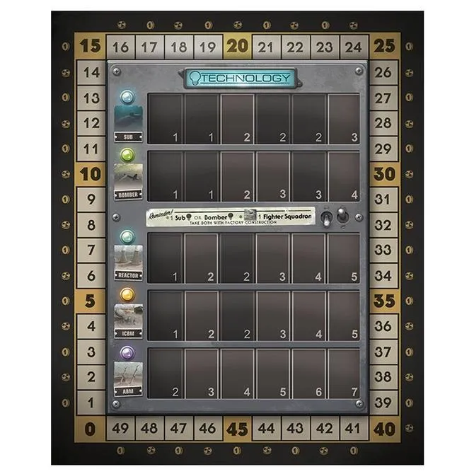 20 years after the end of The Manhattan Project, the superpowers of the world are embroiled in another vicious arms race. Manufacturing nukes is no longer an obstacle; all nations are now capable of churning them out at a rapid pace. The challenge of this era lies in the development of various delivery systems called the "Nuclear Triad:" strategic bombers, ballistic subs, and land-based ballistic missiles. Each player represents one of the superpowers in the arms race. At staged intervals, scoring is conducted in one of 4 categories: - Strategic Bombers - Ballistic Submarines - ICBMs - Short-range missiles deployed to third world nations In addition to earning points for deploying nukes during the scoring rounds, players can also earn defensive bonuses for mitigating the risks imposed against them. The game ends after all of the scoring events have been completed. The player with the most points is the winner.