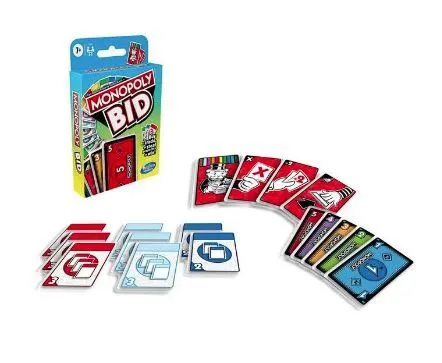 Get ready for an exciting quick-playing Monopoly card game! The Monopoly Bid game is a game of chance, luck, and strategy as players bid in blind auctions, pay with money cards, steal properties with Action cards, and change their luck with Wild cards. Played in rounds, everyone gets a chance to host an auction. When it's time to bid on a property, players choose how much money they want to risk. Then everyone shouts, "1, 2, 3, Bid!" and lays their money cards down. The player who bid the most money gets that property. Collect 3 property sets to win. The Monopoly Bid game is a great choice for game night, for parties, and as an indoor activity for kids 7 and up.