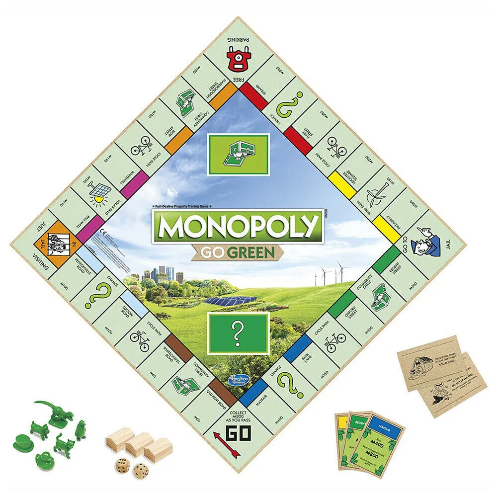 It's time to go green. In the Monopoly: Go Green Edition board game, players buy, sell, and trade properties, and invest in greening them up. Build wooden greenhouses to collect more rent and invest in solar and wind utilities. In this edition of the Monopoly game, greenhouses and dice are made of FSC certified wood from well-managed forests, and tokens are made with plant-based plastic derived from sugarcane, a renewable raw material. The package, gameboard, game guide, money, cards, storage bag, insert, and money tray are made with 100% recycled paper.