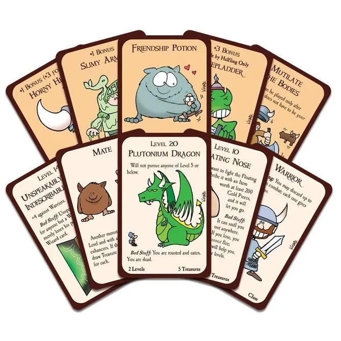 Munchkin is the mega-hit card game about dungeon adventure . . . with none of that stupid roleplaying stuff. You and your friends compete to kill monsters and grab magic items. And what magic items! Don the Horny Helmet and the Boots of Butt-Kicking. Wield the Staff of Napalm . . . or maybe the Chainsaw of Bloody Dismemberment. Start by slaughtering the Potted Plant and the Drooling Slime, and work your way up to the Plutonium Dragon . . .