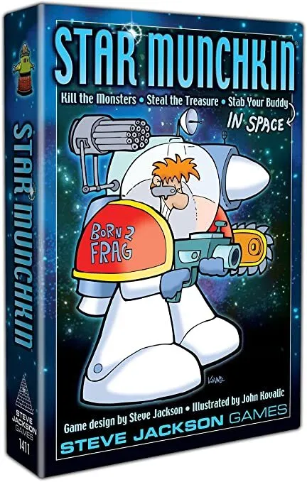 The Munchkins are back – but now they're Mutants, Androids, and Cat People in space, grabbing Lasers, Vibroswords, and Nova Grenades and fighting Fanged Fuzzballs, Bionic Bimbos, and the Brain In A Jar. Star Munchkin is a complete game using the best-selling Munchkin rules (with a few new twists like Sidekicks), and it can be combined with any other Munchkin items.