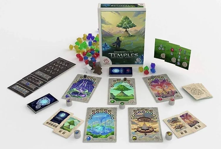 In Mystery of the Temples, players take on the role of Curse Breakers, traveling between the wilderness and the temples in order to collect crystals of various colors. Fusing the colorful crystals on the Crystal Grid in the correct order breaks the curse of the temple, and you earn runes and victory points in the process. Once a player has broken five curses, the game ends. Whoever has the highest amount of victory points wins.