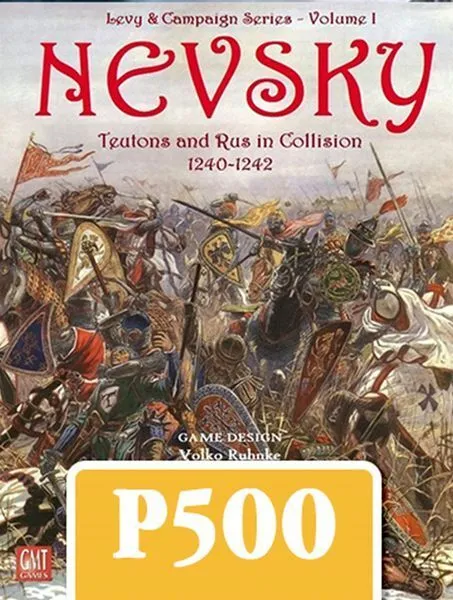 Nevsky: Teutons and Rus in Collision, 1240-1242 is a board wargame about the storied clash between Latin Teutonic and Orthodox Russian powers along the Baltic frontier of the mid-13th-Century. It is the first volume in GMT Games’ Levy & Campaign Series portraying military operations in a variety of pre-industrial conflicts. In Nevsky, players raise and equip their armies, then provision and maneuver them to ravage or conquer enemy territory or defeat enemy forces in battle. Feudal politics obligate an array of lords and vassals to serve on campaign—but only for limited periods. Players must keep an eye on the calendar and reward lords to keep their armies in the field. Nevsky is solitaire friendly or can add a rules option with screens that hide what the two players’ lords levy. A second option adds detail regarding vassal forces’ terms of service. In Nevsky, two players take the roles of “Russians” and “Teutons”, respectively. The Russians represent the wealthy city-state of Novgorod and its allies. The Teutons comprise German and Danish landholders—including the Teutonic Order—expanding a Baltic dominion. The sides every 40 days will levy various lords and vassals and their forces, transport, and capabilities, backed by higher political authorities—a papal legate for the Teutons and Novgorod’s city council (veche) for the Russians. Each lord is rated for fealty, lordship, service, and command and lays out his forces and assets on a mat. Wooden pieces represent units of knights, mounted sergeants, light and Asiatic cavalry, men-at-arms, and unarmored serfs and militia. Assets include counters for transport such as carts, boats, and sleds; provender to feed the army; and coin to pay for longer service or booty captured by ravaging or conquering enemy regions. The players then plan and command a campaign for that 40 days with the lords who have mustered. To represent the limits of communications on medieval operations, stacks of command cards commit players to activating lords in a sequence that may or may not meet the needs of the developing situation. Cylinder pieces on the map show the lords’ maneuvers, while markers on a feudal calendar show how much longer the lords will serve, influenced by success or failure in their campaigns. When lords clash in field battle or storming a castle, players array their lords’ mats left, right, center, and reserve and attempt to rout the enemy. Various event and capability cards reveal cultural and technological particulars that influence levy, campaign, and combat.