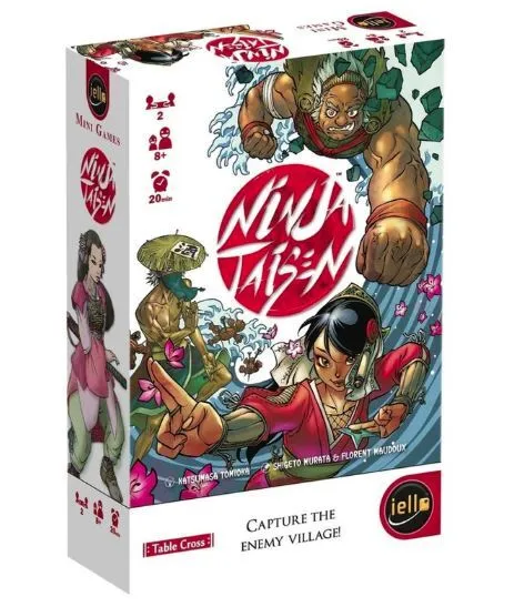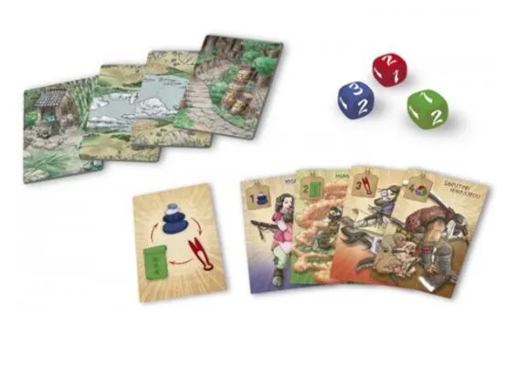 Ninja Taisen is a two-player, dice-driven open information abstract game with a random set-up. Both players have identical sets of ten fighters, with three fighters in each of three colors with values 1–3 along with a tri-colored boss valued at 4; these fighters are placed in small stacks of varying size onto a line that's eleven steps long. On a player's turn, he rolls the three colored dice and can make up to three moves accordingly, with the blue die moving a blue fighter, etc. Moving a fighter that has other fighters on top of him moves these other fighters as well. If, as a result of movement, his fighter (or stack of fighters) encounters an enemy, a fight between the two top cards in each stack occurs, the result of which is decided primarily by the color (via a rock-paper-scissors mechanism) and secondarily by the number (highest wins). If the boss wins a fight, its power is reduced by the enemy's power for the remainder of the current fight; if two fighters draw, they both retreat one step toward their own village, possibly precipitating other fights on the same turn. The fight continues until either pile is depleted. The first player to either defeat all of the opposing fighters or reach the end of the line (and clear out the opponent's fighters in his village) wins.