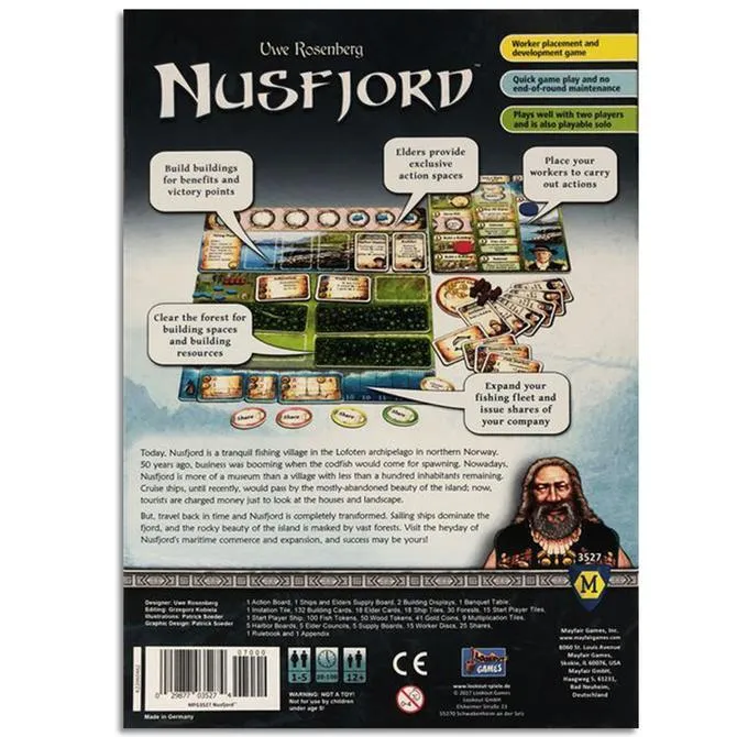 As the owner of a major fishing company in Nusfjord, your goal is to develop and expand the harbor and surrounding landscape. You will do this by using your workers to help you develop your fishing company, persuade village elders in the council to join you, and build buildings for valuable effects and victory points. Plus, don’t forget to expand your fishing fleet to increase your fishing capacity, and issue shares in your company for a quick gold or two. You also need to balance the clearing and reforesting of your land for building resources. And don’t forget the ever important gold needed to buy shares, which can earn you additional fish and points. In the end, the player with the best fishing company (and most points) wins the game!