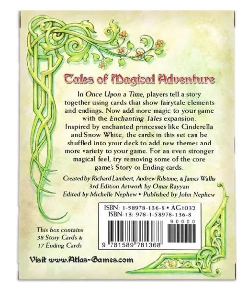 In Once Upon a Time, players tell a story together using cards that show fairytale elements and endings. Now add more magic to your game with the Enchanting Tales expansion. Inspired by enchanted princesses like Cinderella and Snow White, the 38 Story Cards and 17 Ending Cards in this set can be shuffled into your Once Upon a Time storytelling card game deck to add new themes and more variety to your game. For an even stronger magical feel, try removing some of the core Story or Ending Cards.