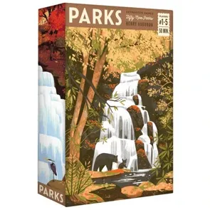 PARKS is a celebration of our National Parks featuring illustrious art from Fifty-Nine Parks. In PARKS, players will take on the role of two hikers as they trek through different trails across four seasons of the year. While on the trail, these hikers will take actions and collect memories of the places your hikers visit. These memories are represented by various resource tokens like mountains and forests. Collecting these memories in sets will allow players to trade them in to visit a National Park at the end of each hike. Each trail represents one season of the year, and each season, the trails will change and grow steadily longer. The trails, represented by tiles, get shuffled in between each season and laid out anew for the next round. Resources can be tough to come by especially when someone is at the place you’re trying to reach! Campfires allow you to share a space and time with other hikers. Canteens and Gear can also be used to improve your access to resources through the game. It’ll be tough to manage building up your engine versus spending resources on parks, but we bet you’re up to the challenge. Welcome to PARKS!