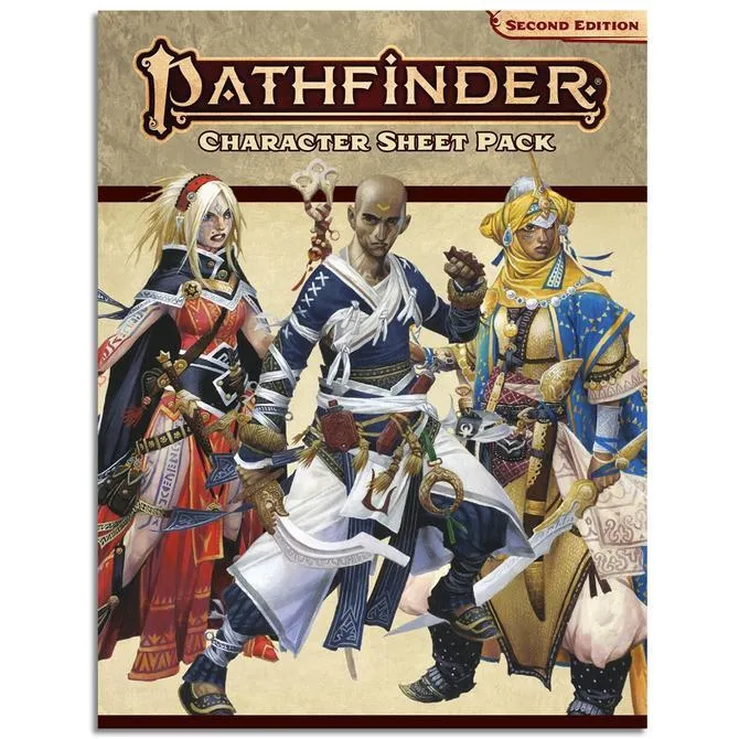 Get the most out of your Pathfinder heroes with these gorgeously designed black-and-white character sheets designed for ease of use and high in-game utility! With a specially designed two-sided character sheet for each of the 12 character classes in the Pathfinder Core Rulebook and additional sheets for tracking equipment and spells, there’s no better way to bring a touch of class to your character’s life! Collected into a special folder with flaps for easy care of character sheets, handouts, and more, the Pathfinder Character Sheet Pack has what you need to get the most out of your Pathfinder Second Edition hero!