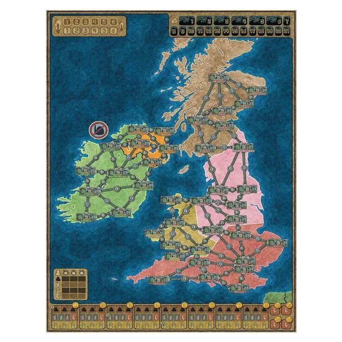 United Kingdom & Ireland: The players can operate two different networks on these two isles. With no direct connection between Ireland and Great Britain, starting the second network costs the player dearly. Additionally, this region changed from a resource exporter to an importer in a very short time, so >>Step 3<< starts earlier when playing on this map.