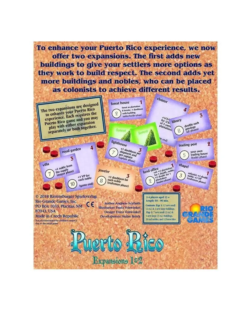 To enhance your Puerto Rico experience, we now offer two expansions. The first adds 12 new buildings (two of each) to give your settlers more options as they work to build respect. It also add two new large builds to add options for end-game scoring. The second adds seven small buildings (including one new production building) and one large building (again for end-game scoring).