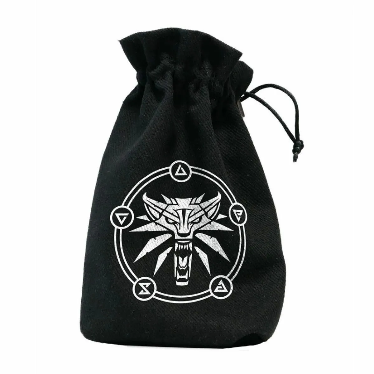 With swords and magic. This dice pouch, inspired by The Witcher franchise, depicts the well-known School of the Wolf symbol, placed among a circle of witcher signs. Made of sturdy black cotton with a white print, the bag is straightforward and effective — just like the master witcher himself. Closed with durable strings, it can hold 5 full sets of dice.