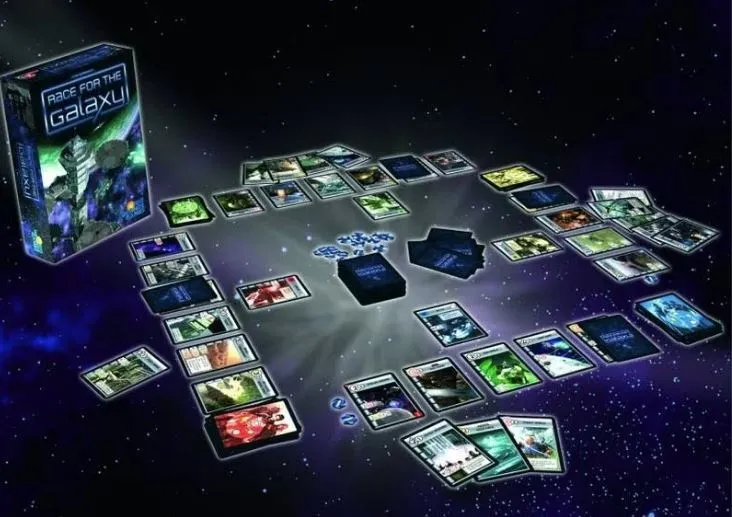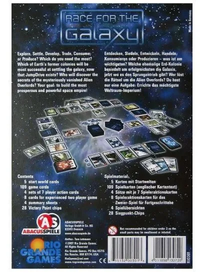 In the card game Race for the Galaxy, players build galactic civilizations by playing game cards in front of them that represent worlds or technical and social developments. Some worlds allow players to produce goods, which can be consumed later to gain either card draws or victory points when the appropriate technologies are available to them. These are mainly provided by the developments and worlds that are not able to produce, but the fancier production worlds also give these bonuses.