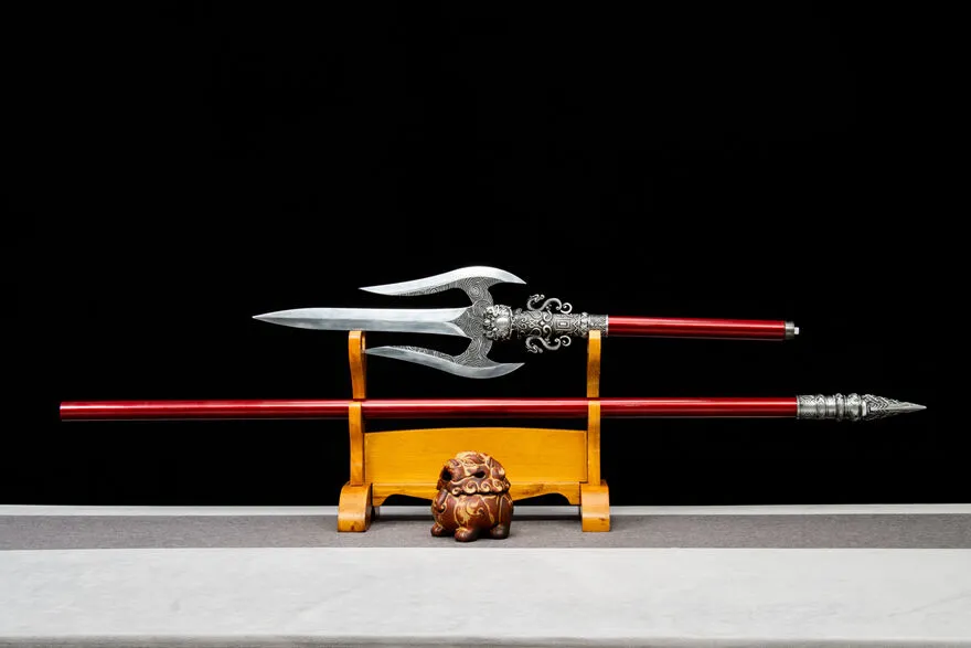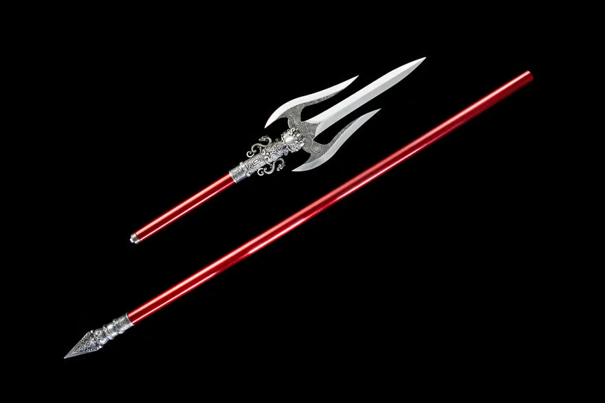 Bring tradition and strength together with the Red Dragon Trident, designed with a bold red shaft and a triple-blade dragon motif. Made from high-performance manganese steel with a sturdy iron shaft coated in baked enamel, it combines durability with elegance. The alloy fittings add a refined touch, making this trident ideal for martial arts training, stage performances, or as a unique collectible display piece.