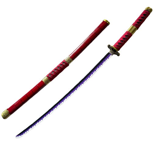 The sword features a vibrant red lacquer scabbard (Saya) and handle wrapping, contrasted beautifully with elaborate gold-tone fittings. The highlight of this model is the eye-catching purple gradient finish on the blade, adding a dramatic, almost cursed, visual effect that makes it a spectacular display piece for any One Piece fan or Japanese sword enthusiast.