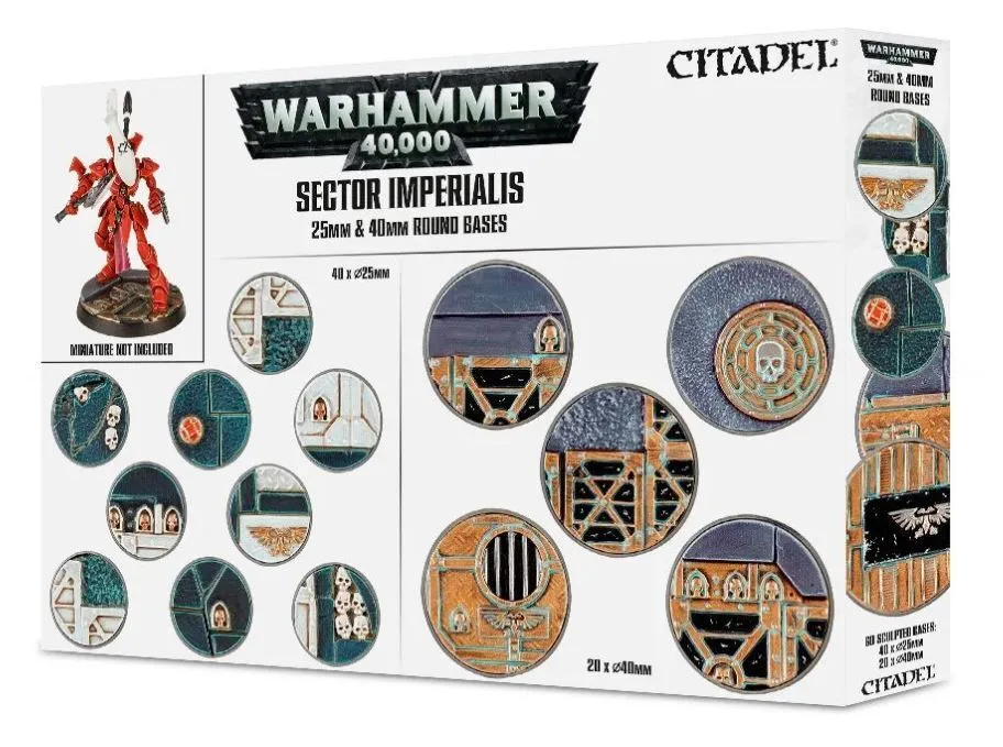 Designed to match and complement the Realm of Battle: Sector Imperialis gameboard, these awesome, highly detailed plastic bases are ideal for the infantry in your Warhammer 40,000 collection. You’ll receive 40 25mm Round bases and 20 40mm Round bases, with 32 extra skulls for decoration – these moulded bases will help you theme your armies to match the Sector Imperialis!