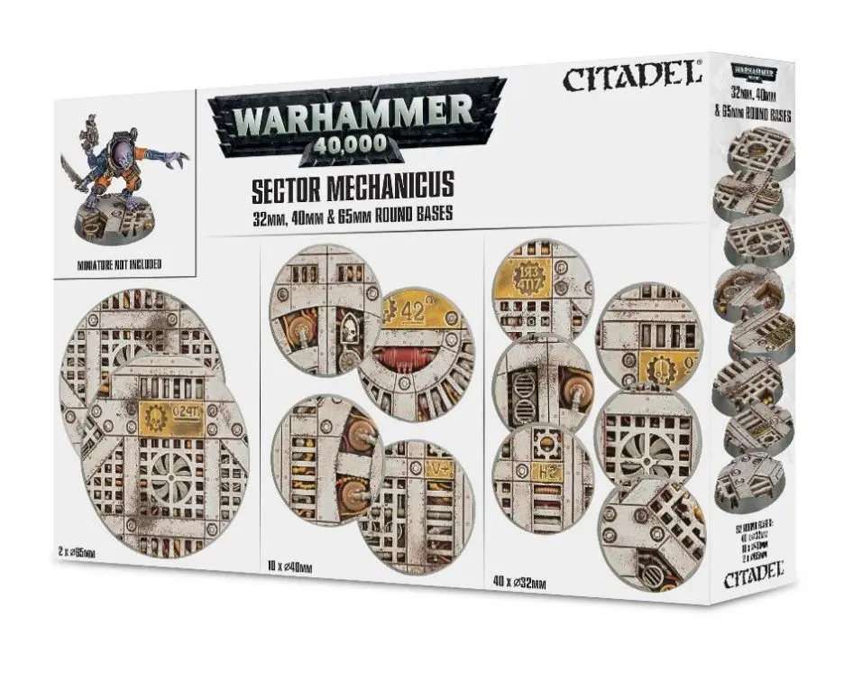 Designed to complement the Sector Mechanicus scenery range, this box of 52 highly detailed Citadel plastic round bases contains three different sizes, and features the same textures as the rest of the Sector Mechanicus range. There’s a host of pipework, vents, cogs and Adeptus Mechanicus symbols for your miniatures to stand atop – they’ll look at home in the murky industrial confines of the Sector Mechanicus.