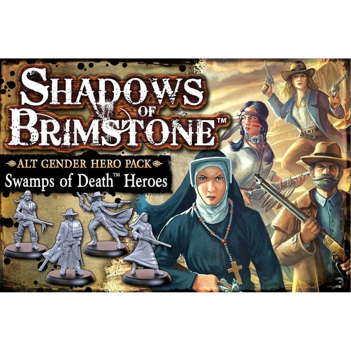 Every Hero Character Sheet in Shadows of Brimstone has a Male Portrait on one side and a Female Portrait on the other. This set contains the Miniatures for the Alternate Gender versions of the Heroes that come as part of the Swamps of Death Core Set. This set also includes all of the cards, counters, character sheets, and upgrade charts needed to use these as additional Heroes in your games of Shadows of Brimstone.