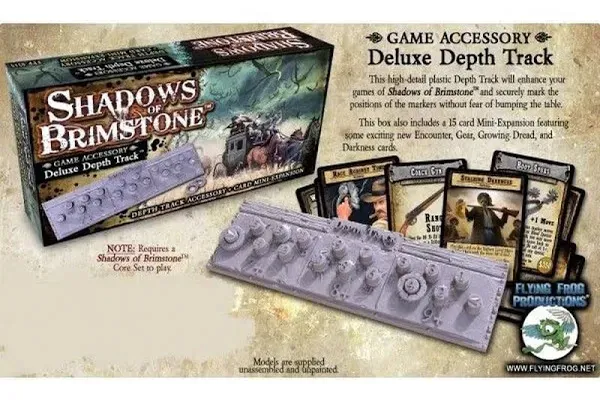 The Deluxe Depth Track Expansion is a great way to add a bit of extra flair and theme to your Shadows of Brimstone adventures! This set includes 1 large high-detail plastic Depth Track for use while adventuring down in the dusty Mines of the Old West, as well as 1 textured plastic Hero Posse marker ring and 1 textured plastic Darkness marker ring. This set also includes 15 new cards for the game (4 Gear, 3 Mine Encounters, 4 Darkness, and 4 Growing Dread). They are themed for racing against time to hold the darkness at bay!
