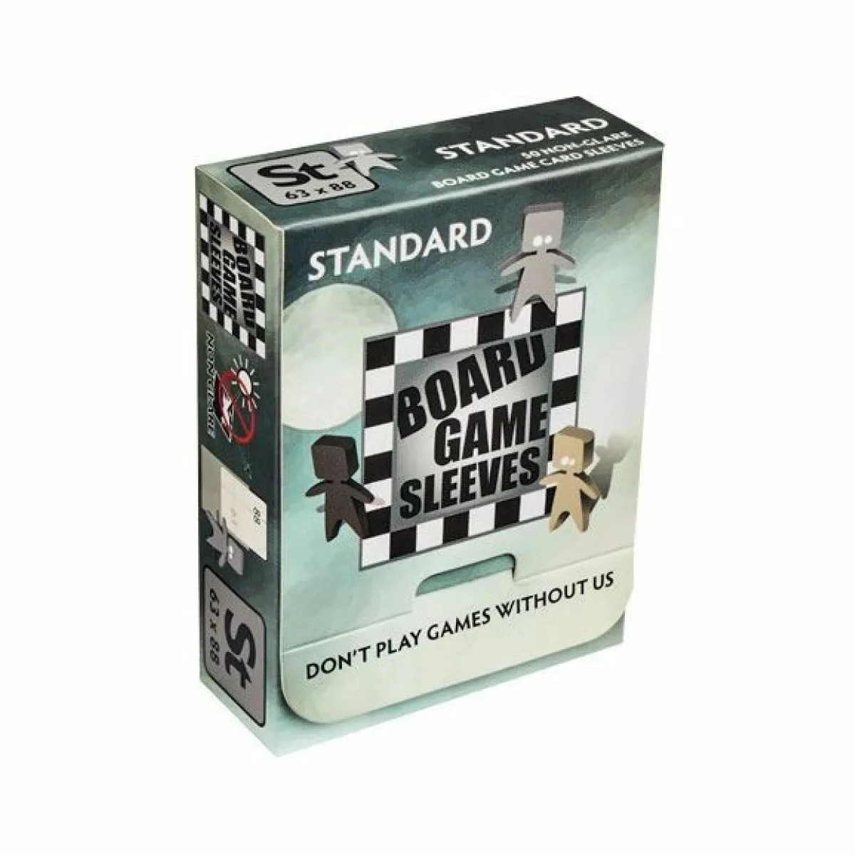 50 non-glare board game card sleeves For cards measuring up to 63 x 88mm (2½” x 3½”). This size is typical for trading card games like Magic the Gathering or Pokémon, and are also found in many newer board games. The cardbox safely stores 50 sleeved cards, and doubles as a card-holder during play. Just flip back the lid and lock it in place! Contains 50 clear card sleeves in 80µ polypropylene, with a soft non-reflective matte treatment. No acid. No PVC.