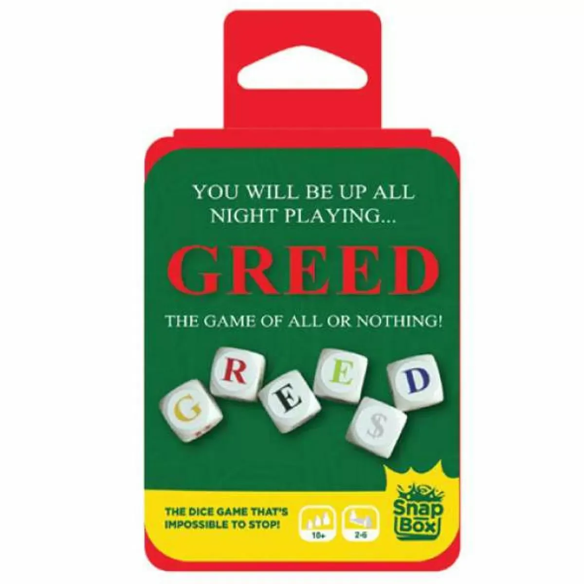 All the fun of classic Greed, the all or nothing dice game, in mini Snapbox format! Each player needs 500 points in a single round to get into play. To win the game, players need to obtain the highest score over 5,000 points. Roll all six dice, take out the dice which score and roll again. Players may roll as long as they score, but don’t get too greedy, or you’ll lose it all!