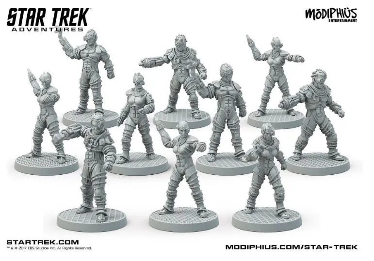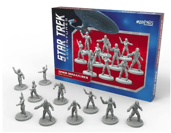 This box set of 10 highly detailed, 32mm scale, resin miniatures of Borg drones contains 5 male and 5 female Borg drones, with 30mm scenic bases incorporated into each figure. These miniatures are designed for use with the Star Trek Adventures roleplaying game and geomorphic game tiles. Some assembly may be required, and the miniatures are supplied unpainted.