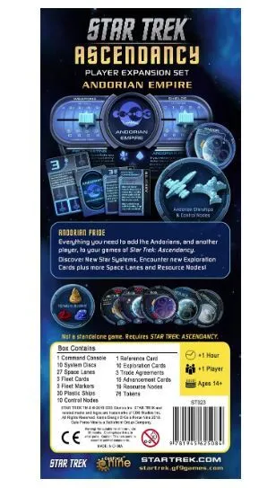The Andorian Empire adds new Star Systems, new Exploration Cards, plus all the components to add another player to Star Trek: Ascendancy.