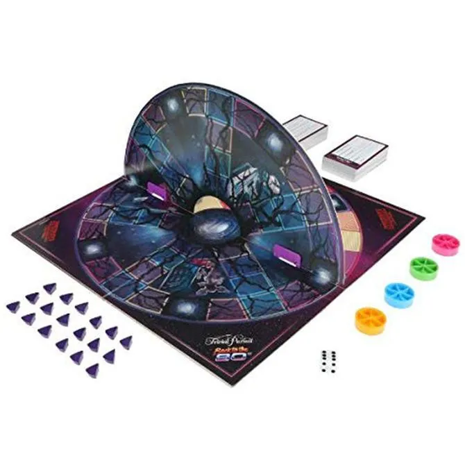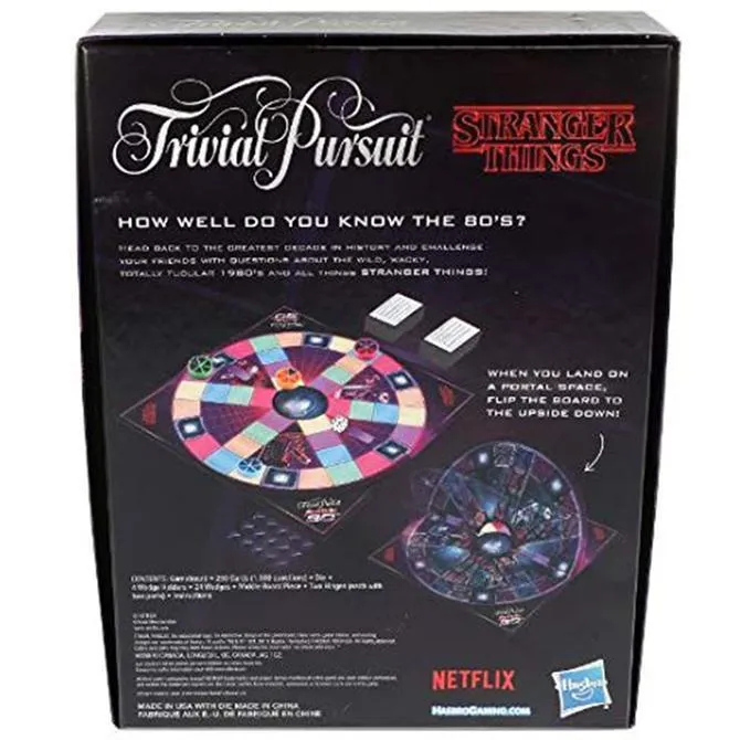 How well do you know the 80s? Head back to a great decade in history and challenge friends with questions about the wild, wacky, totally tubular 1980s and all things Stranger Things! This edition of the Trivial Pursuit game features 1500 trivia questions from 6 categories: Movies; TV; Music; Famous People and Events; Trends, Tech and Fun; and Stranger Things. The party game also includes Portal Spaces; land on one and you have to flip a section of the board over and send all players to the Upside Down where you can lose wedges. The first player to collect 6 wedges wins. For fans of the Netflix original series, and those looking for a lighthearted and entertaining board game for game nights, get-togethers, and parties, The Back to the 80s edition of the Trivial Pursuit game makes a great choice. Product Features 2 to 4 players Features Portal spaces sending players to the Upside Down 1500 Questions 6 Categories Retro styled game board Box Contents Gameboard 250 Trivia cards Die 4 Wedge holders 24 Wedges Middle board piece 2 Hinges Cardholder Instructions