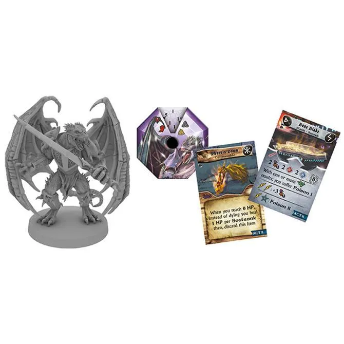 This Hero Pack features two miniatures of Volkor (normal and Ghost Soul form), his Soul Gem, and new cards — including two legendary treasures, the deadly Bone Blade and the life– saving Phoenix Down.