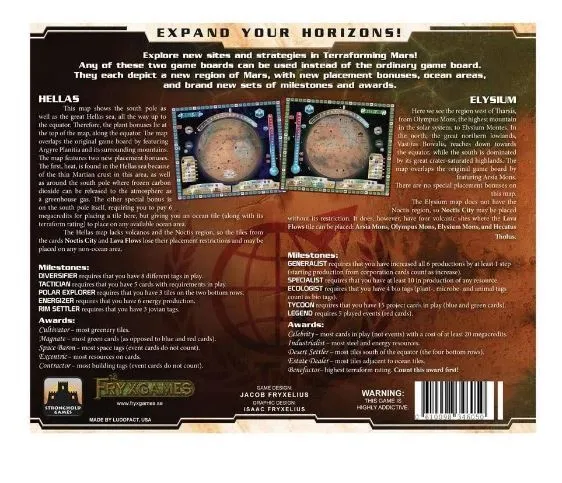 Terraforming Mars: Hellas & Elysium, the first expansion for the 2016 smash-hit Terraforming Mars, consists of a double-sided game board representing two new areas of Mars: Hellas, which includes Mars' south polar region; Elysium, which is on the opposite side of Mars' equator.